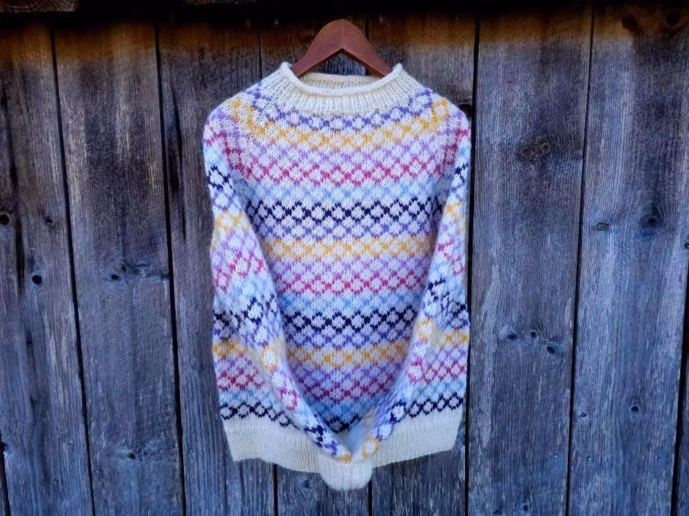 Färg B, C, D, E, F: 1 nystan vardera (garnåtgången varierar beroende på hur många färger man väljer)
